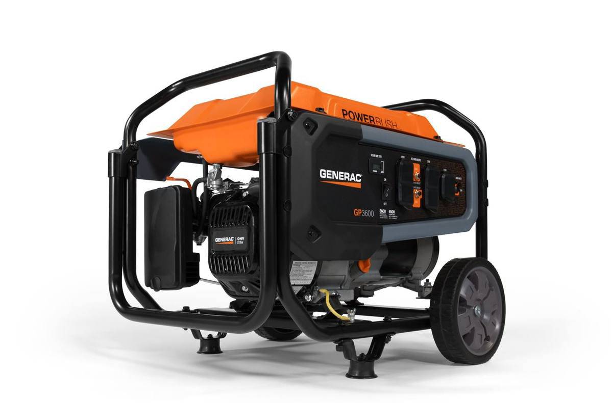 The 3600-watt Generac GP3600 portable generator can be used to tackle home projects, provide power for tools, or deliver essential electricity in the case of an outage. It is an especially affordable solution with premium features. These include PowerRush™ Advanced Technology — delivering over 40% more starting capacity* —an OHV engine for longer engine life and a large-capacity steel fuel tank with an incorporated fuel gauge for durability. The hardened steel tube cradle provides added strength, while the low-oil level shutdown protects your engine from damage. Heavy-duty, never-flat wheels and a foldable handle make for easy transportation of the generator. The compact size of the GP3600 ensures it will take up minimal storage space in the garage.