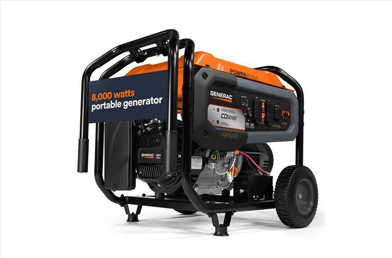 Generac’s GP8000E offers many benefits that make this model a favorite for emergency power or recreational use. PowerRush™ Advanced Technology delivers over 30% more starting capacity* (*increase electrical current upon demand above rated output when starting electric motors), and electric start makes the GP8000E easy to use (battery included). You’ll always be prepared with the plug-in battery jack that keeps the battery charged and ready for unexpected outages. The long-lasting OHV engine and large-capacity steel fuel tank with fuel gauge provide increased durability and up to an 11-hour runtime at 50% load. Rough or rugged environments will not be an issue thanks to the covered outlets for added protection, heavy-duty wheels that will never go flat and a fold-down handle that will enable you to easily transport your generator to any location. The low-oil feature will automatically shut down the generator, preventing damage to the unit, while the hardened 1.25-in. steel-tube cradle increases strength and resilience. And with the regular maintenance alerts provided by your hour meter, you’ll never be caught off guard.
